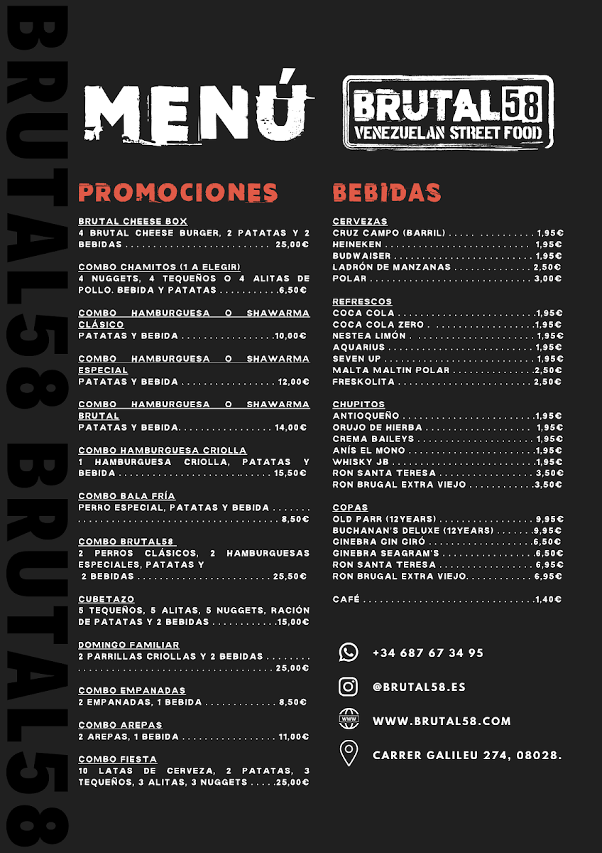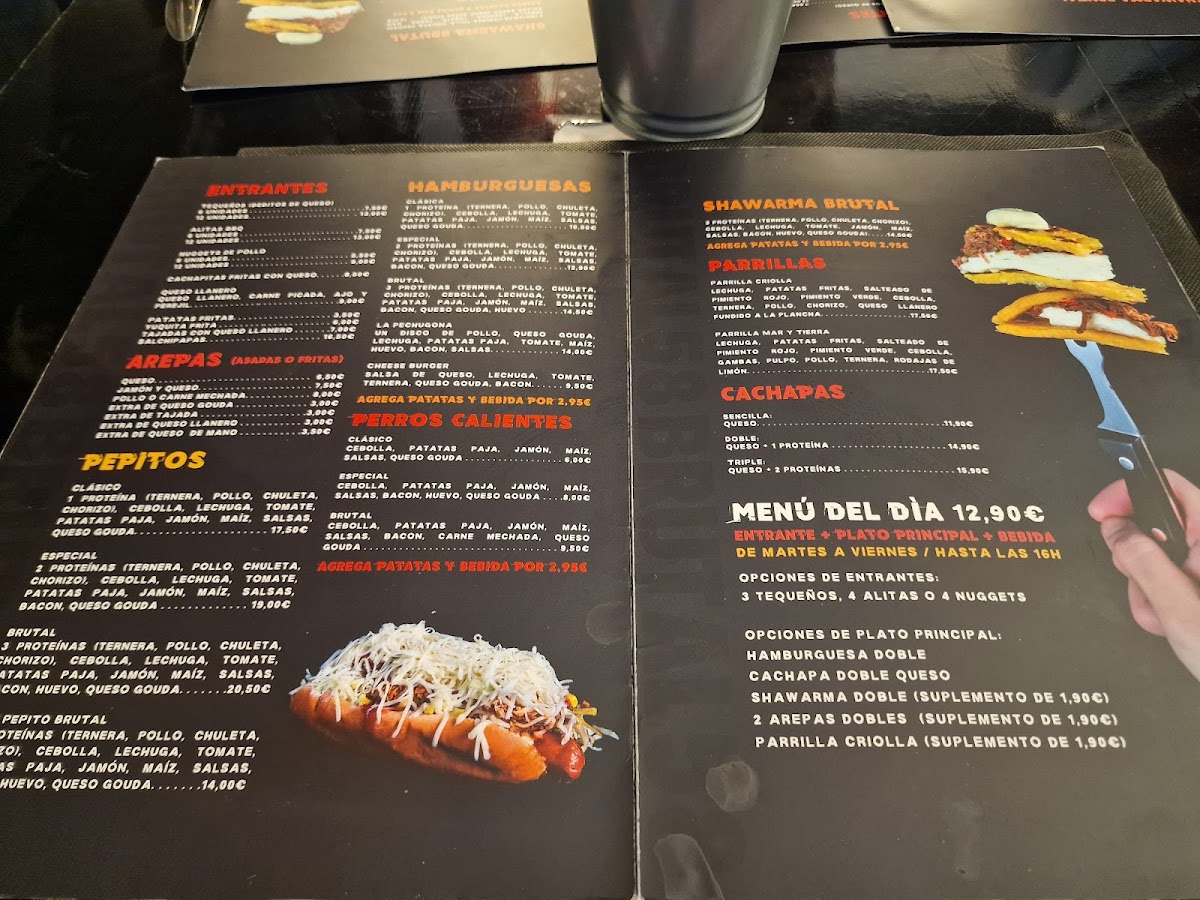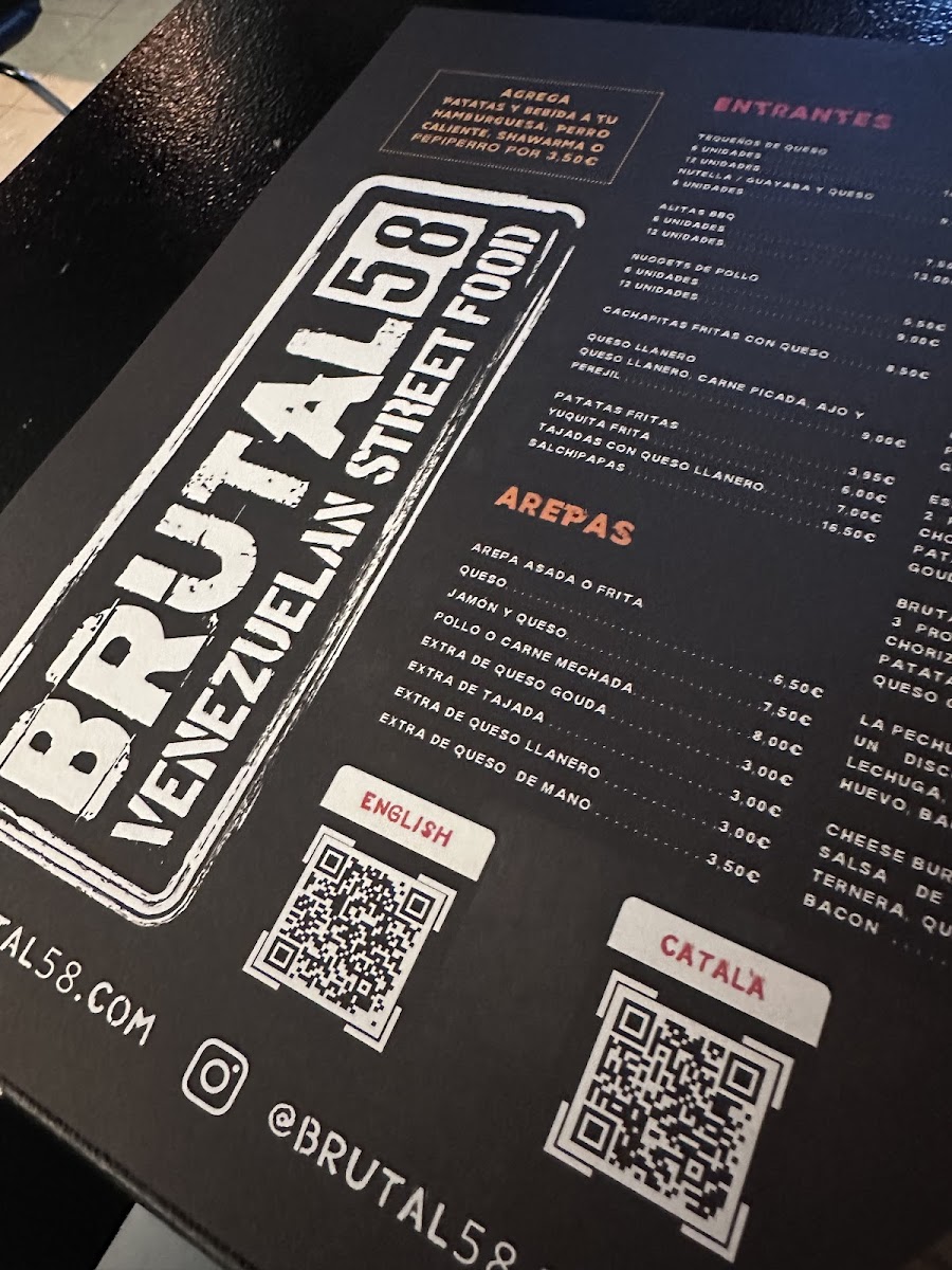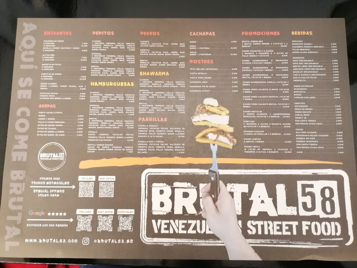 Introducing the vibrant world of Brutal58, a unique Venezuelan restaurant nestled in the heart of Barcelona's Les Corts. Located at Carrer de Galileu, this hotspot brings an authentic taste of Venezuelan street food, encapsulated in generous portions and bursting with flavor. From the iconic Perro Caliente styled with bacon and gouda cheese to the crispy Tequeños, each dish is designed to whisk diners away on a culinary journey. Guests rave about the colossal Pepito, a sumptuous sandwich perfect for sharing, accompanied by a selection of zesty sauces. The friendly staff enhance the experience, offering insights into Venezuelan cuisine. The ambiance is lively yet cozy, making it an ideal spot to unwind. With a refreshing selection of beverages like Maltin Polar and KAS, every visit promises to be an unforgettable delight for both new and seasoned food adventurers.