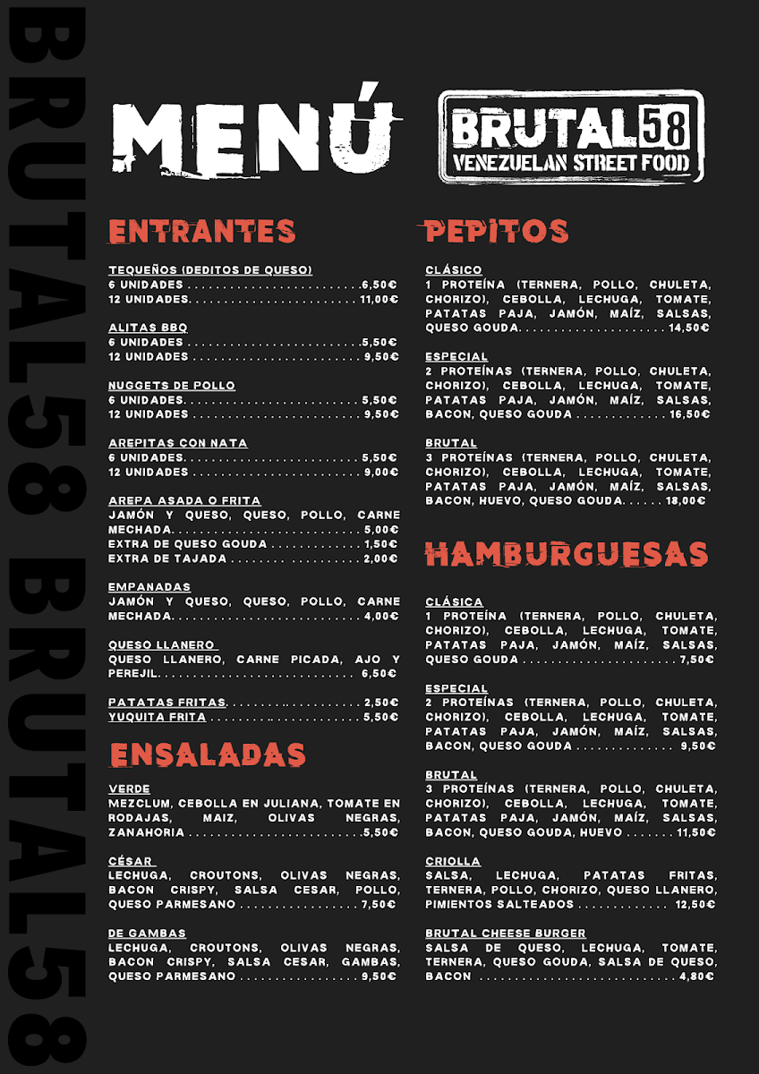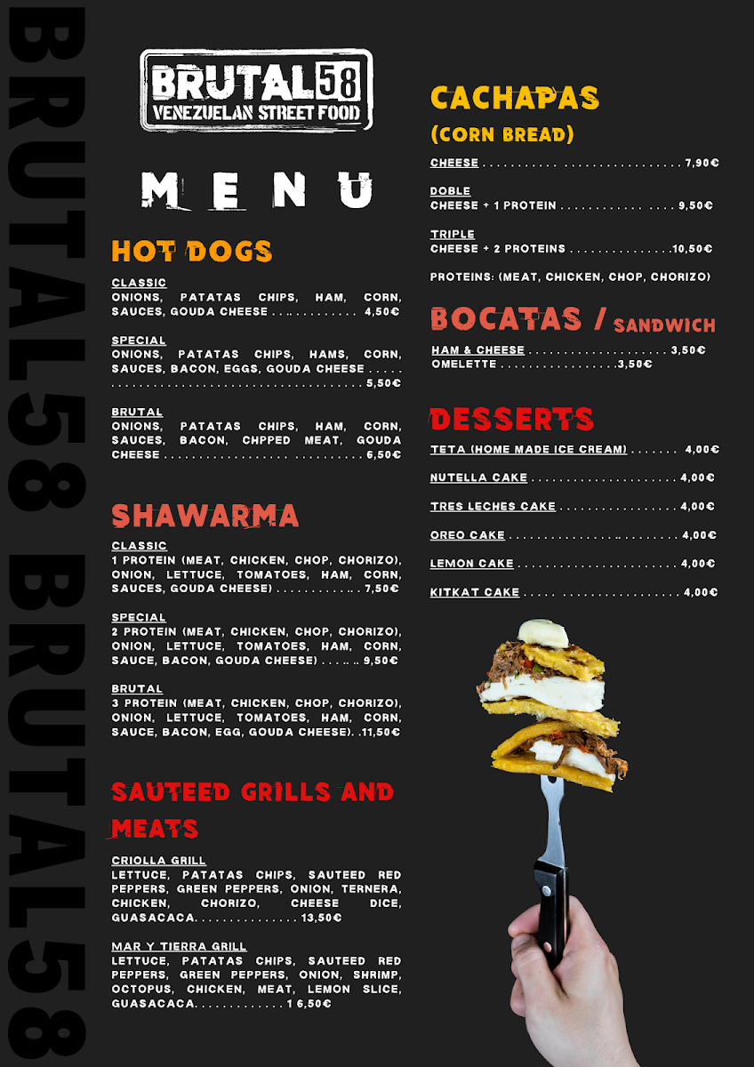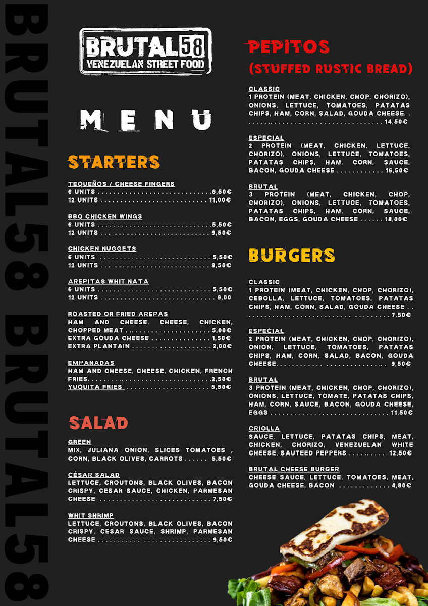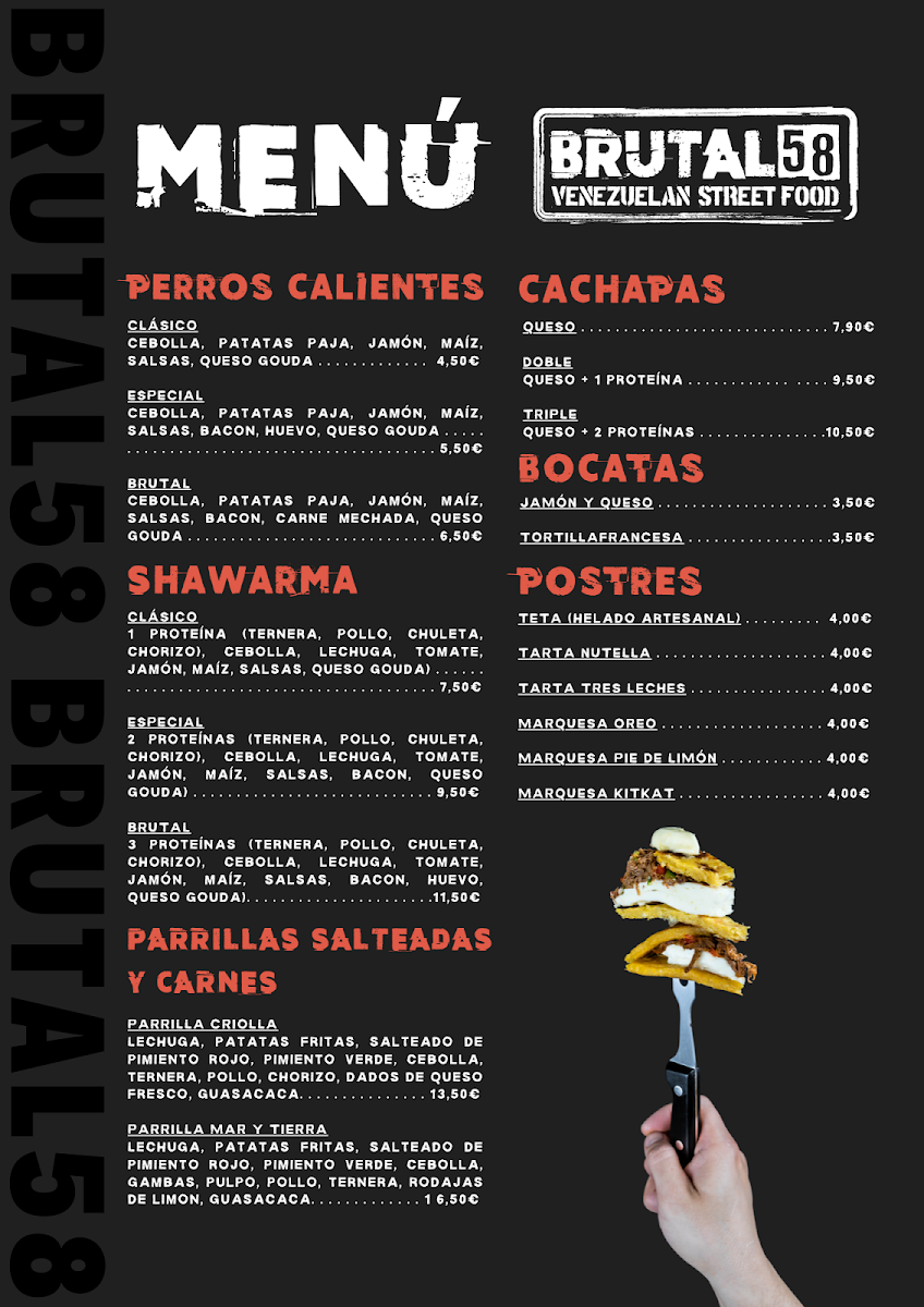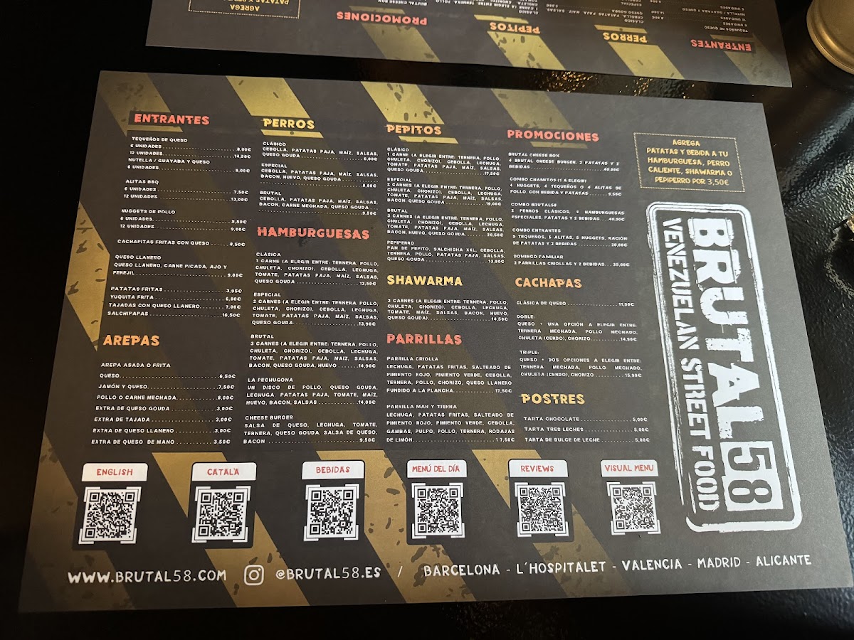 Introducing the vibrant world of Brutal58, a unique Venezuelan restaurant nestled in the heart of Barcelona's Les Corts. Located at Carrer de Galileu, this hotspot brings an authentic taste of Venezuelan street food, encapsulated in generous portions and bursting with flavor. From the iconic Perro Caliente styled with bacon and gouda cheese to the crispy Tequeños, each dish is designed to whisk diners away on a culinary journey. Guests rave about the colossal Pepito, a sumptuous sandwich perfect for sharing, accompanied by a selection of zesty sauces. The friendly staff enhance the experience, offering insights into Venezuelan cuisine. The ambiance is lively yet cozy, making it an ideal spot to unwind. With a refreshing selection of beverages like Maltin Polar and KAS, every visit promises to be an unforgettable delight for both new and seasoned food adventurers.
